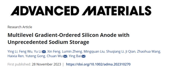 安博官方网站材料学院白莹教授研究小组在钠离子电池负极材料研究中取得重要进展,11月28日,相关研究成果以“Multilevel Gradient-Ordered Silicon Anode with Unprecedented Sodium Storage”为题在国际知名期刊 Advanced Materials 上发表。安博官方网站材料学院白莹教授、吴川教授和李雨副研究员为本论文共同通讯作者,材料学院博士后李莹为第一作者。