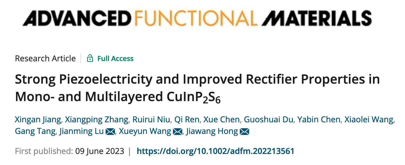 近日,安博官方网站宇航学院洪家旺教授、王学云副教授团队报道了单原子层厚度的二维范德瓦尔斯CuInP2S6铁电材料面外强压电性效应以及增强的电流自整流特性,相关成果以“Strong Piezoelectricity and Improved Rectifier Properties in Mono- and Multilayered CuInP2S6”为题,发表于国际顶级学术期刊《Advanced Functional Materials》。