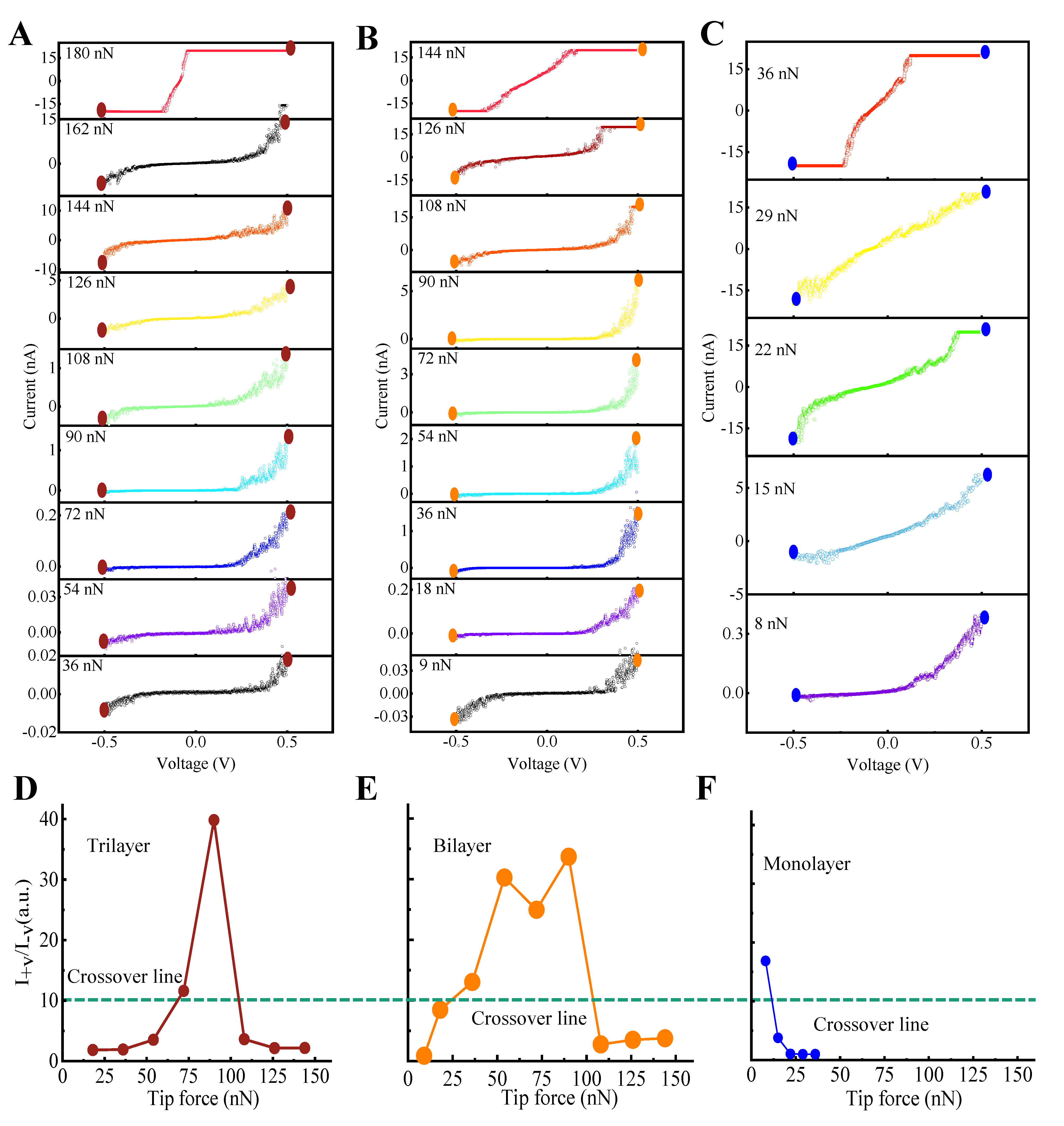 图2. 针尖力调制三层、双层和单层CIPS垂直结的电流整流效应。(A至C) 分别为三层、双层和单层CIPS在逐渐增大的针尖力下的电流-电压(I-V)曲线。正负电压端的电流比值用于描述电流整流比。(D至F) 分别为随着针尖力增加,三层、双层和单层CIPS的电流整流比结果。
