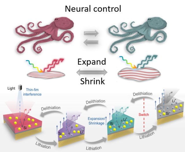 大自然中有多种能够自适应变色伪装的生物,以章鱼为例,当外界环境发生改变时,章鱼能够通过主动调控皮肤细胞中蛋白质的体积来改变光在不同界面的相位差,从而实现皮肤变色。方岱宁课题组通过设计具有稳定可逆膨胀的硅膜电极,模仿章鱼皮肤变色机理,巧妙地利用嵌锂电位(<1 V),精确控制锂离子在硅薄膜中的脱嵌行为,实现硅膜的高精度体积变化调控,改变硅膜结构对光线反射产生干涉消光条件,获得一系列绚丽色彩。值得一提的是,调控硅薄膜中的嵌锂程度,可以实现关闭或开启光线干扰作用,器件可以实现彩色至银色的切换功能。