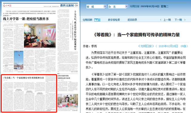 《等着我》延续了第一部《回家》挖掘家庭对个人成长的重大影响这一创作思路,着重展现一个家族中价值观念的代际传承对个体成长的塑造作用。该剧根据真人真事改编,以一位七旬老人寻找90多岁母亲的故事为线索,动人展现了一个家庭四代人在不同历史时期的人生经历与选择。该剧大量运用纪录片的影像资料,配合平实的电视剧镜头语言展现横跨大半个世纪中国社会的历史变迁,通过摘取一家人生命中几个重要的时间节点,讲述主人公与父亲之间的信念传承,描绘主人公与母亲二人间大半个世纪的思念与寻找,勾勒了主人公成年后奔赴战场、不求名利、收养孤儿的跌宕经历,展现主人公家庭每一代长辈的人生态度对后代的积极影响。在四代人一次又一次平凡而又伟大的选择中,将其家国情怀、职业操守、重信守诺、友善助人的价值观念润物无声地表现出来,激发情感共鸣,直指人心。爱奇艺的网友评论认为,该片正能量满满、特别感人,尤其是主人公一家传承不息的“好男儿自食其力站着生,大丈夫以身报国不畏死”的家训,给观众留下深刻印象。