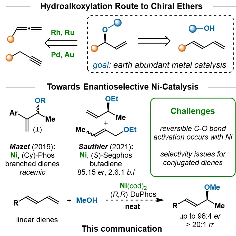 醚(C-O)键广泛存在于药物、农用化学品和功能材料中,其高效构筑吸引了研究者越来越多的关注。通常C-O键是通过Rh、Ru、Pd或Au等贵金属催化的炔烃或联烯的氢烷氧基化反应来构筑(图1)。通过廉价易得的丰产金属(例如Ni)催化1,3-二烯的氢烷氧基化来构建C-O键,最近引起化学家们的兴趣。然而Ni催化1,3-二烯的氢烷氧化反应目前主要面临两个挑战:1) Ni通常会可逆地活化C-O键,导致产物消旋化;2) 反应的区域选择性问题。为了解决这些挑战,近日安博官方网站杨小会课题组首次报道了无溶剂条件下Ni催化1,3-二烯的不对称氢烷氧化反应,能以高对映选择性和区域选择性地构筑C-O键(图1)。