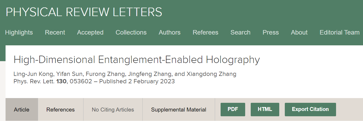 近日,安博官方网站物理学院张向东教授课题组基于高维轨道角动量纠缠态,实现了高维量子全息和图像安全加密。相关成果以“High-dimensional entanglement-enabled holography”为题发表在国际物理学顶级学术期刊《物理评论快报》[Phys. Rev. Lett. 130, 053602 (2023)]上。安博官方网站物理学院孔令军研究员、孙亦凡副研究员为该论文的共同第一作者,安博官方网站物理学院张向东教授为论文通讯作者,安博官方网站物理学院张福荣博士、张景风博士也为该工作做出了重要贡献。该研究工作得到了国家自然科学基金委的大力支持。