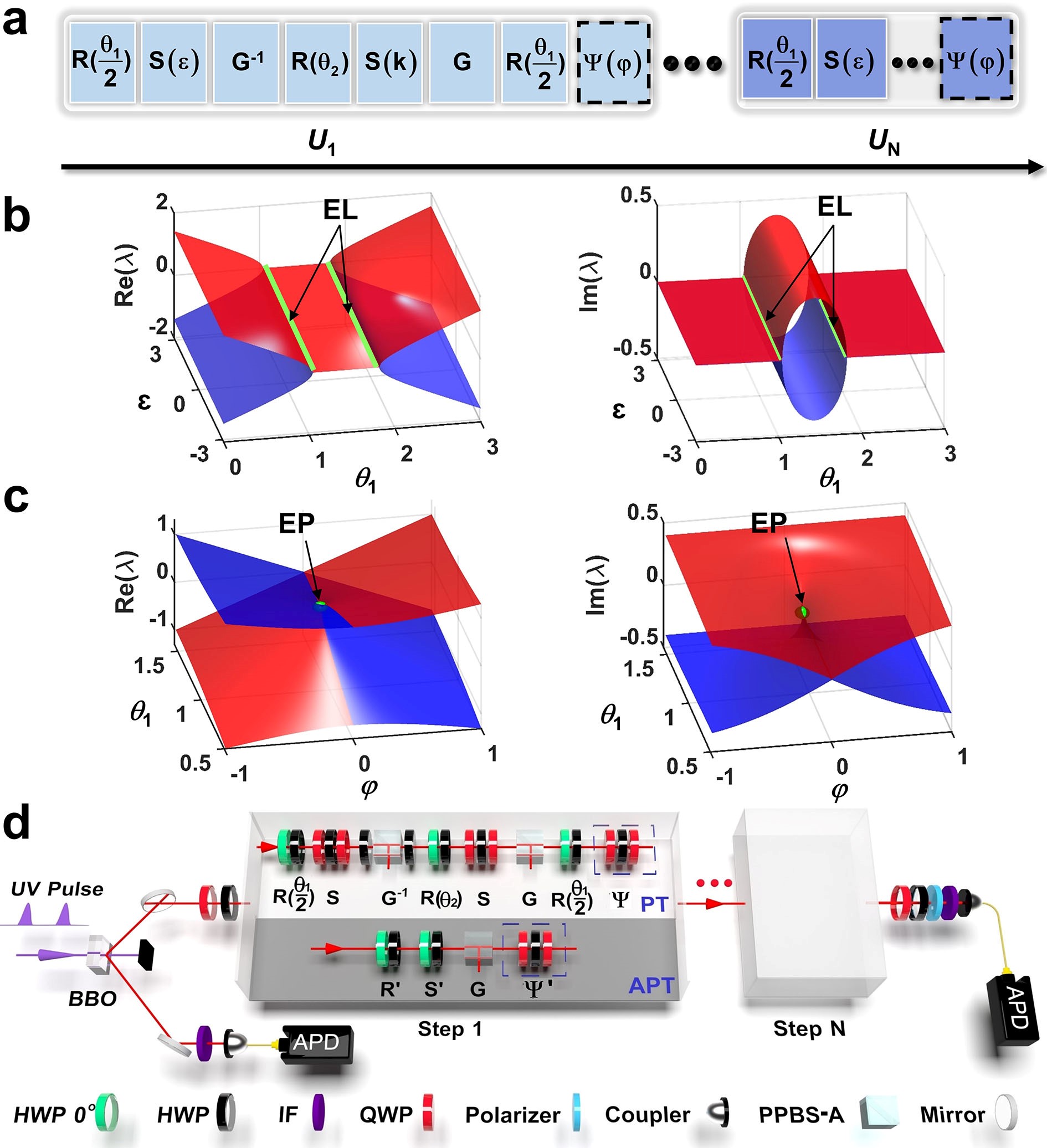 之前的研究都是使用哈密顿量来描述环绕奇异点的动力学特性。在该工作中,研究团队构造了非厄米量子行走来描述环绕奇异点或奇异线的动力学过程。如图1a所示是一个包含N步的非厄米量子行走系统来控制量子态的演化的示意图,其中第1步(N)的演化过程由时间演化算子 U 1 ( U N )描述。这里的非厄米量子行走是由多种算符组成的。以第一步为例,可以表示为