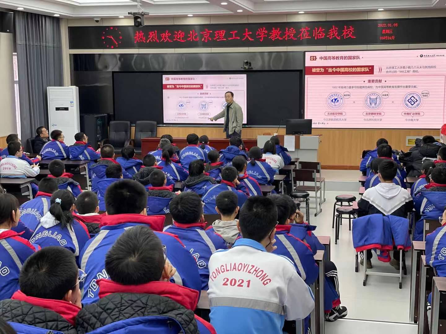 招生组在通辽第五中学举行了优秀生源基地授牌仪式暨人才培养座谈会。通辽市教育局副局长田向阳,通辽第五中学校长王子忠、党委书记白茹、副校长沈润生、副校长高占清等参加座谈会。会上,王文中教授作题为“相约北理 共筑梦想”的主题宣讲,高一、高二年级学生代表及高三年级学生家长代表参加宣讲。随后,招生组分别在通辽第一中学、通辽实验中学召开了两场宣讲会,通辽第一中学校长陈久明,通辽实验中学校长周玉、副校长陈玉国等参加了宣讲会。