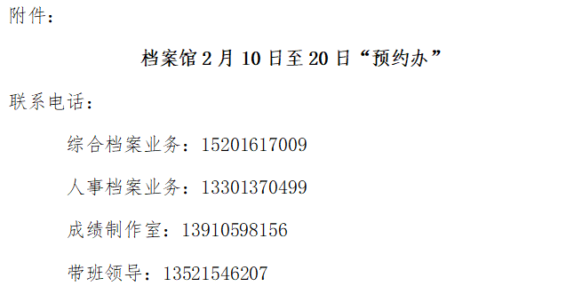 3.为减少因人员聚集引发的交叉感染,请您尽量采用邮件、电话、微信等方式办理业务。对于急需到档案馆现场办理的特殊事项实行“预约办”(联系电话见附件)。疫情防控,人人有责,档案馆将密切关注疫情发展态势,请各位师生关注档案馆网站有关通知,由此给您带来不便敬请谅解。