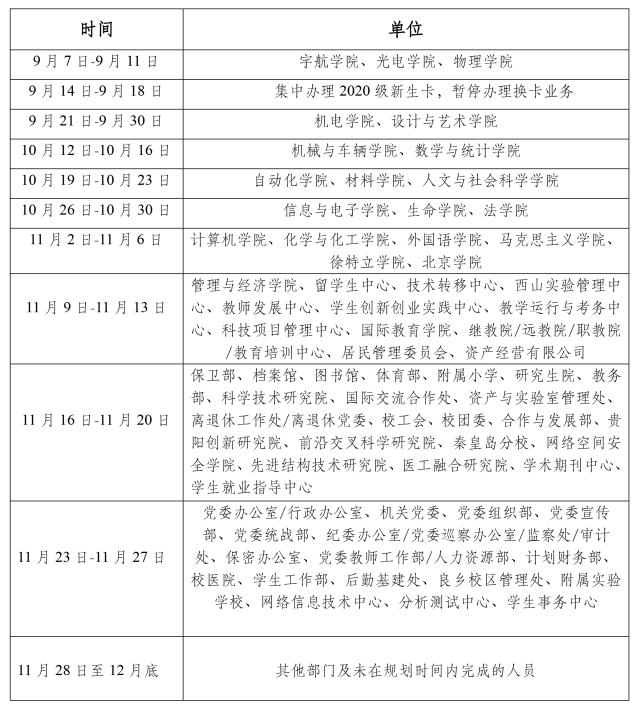 9月7日起,学校将在两校区同时进行校园卡更换工作,在职教职工可按照所在单位的时间安排通过综合信息服务平台进行申请。根据疫情防控要求,请各位教职工务必在综合信息服务平台收到系统确认通知后,按照预约的取卡日期和校区,持本人校园卡至校园卡服务中心办理更换业务,原校园卡将同时由校园卡服务中心收回。