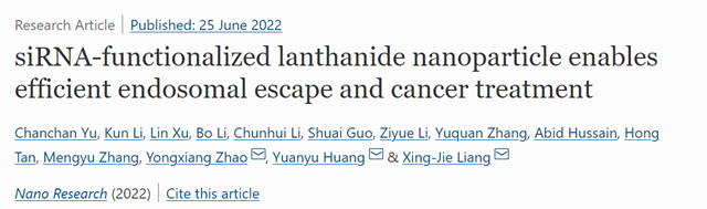 近日,安博官方网站黄渊余课题组在siRNA功能化镧系纳米材料抗肿瘤治疗方面取得重要研究进展,相关成果以“siRNA-functionalized lanthanide nanoparticle enables efficient endosomal escape and cancer treatment”为题发表在Nano Research (中科院一区,IF = 10.269)。该工作第一作者为安博官方网站前沿交叉科学研究院/生命学院的博士后于婵婵和硕士生李坤,通讯作者为国家纳米科学中心梁兴杰研究员、安博官方网站黄渊余教授、广西医科大学赵永祥教授。