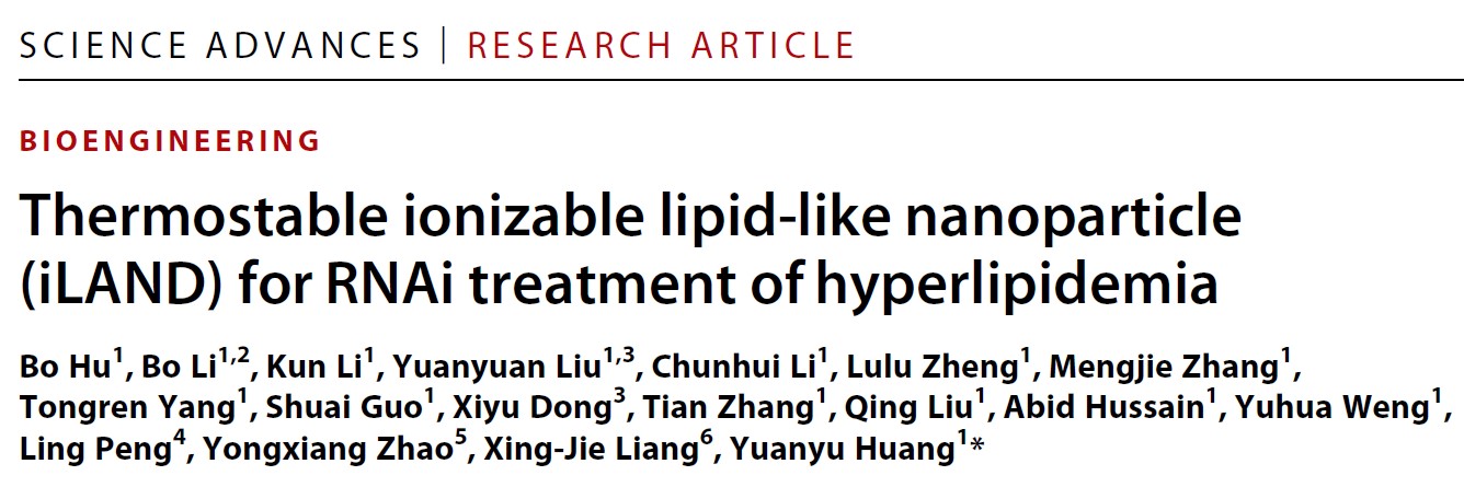 近日,安博官方网站前沿交叉科学研究院黄渊余课题组在新型可电离脂质的核酸递送载体以及降血脂siRNA药物研究方面取得重要研究进展。该成果以《Thermostable ionizable lipid-like nanoparticle (iLAND) for RNAi treatment of hyperlipidemia》为题发表于《Science Advances》(IF= 14.136)。该论文第一作者为安博官方网站生命学院/前沿交叉科学研究院博士研究生胡泊,通讯作者为黄渊余教授。前沿交叉院李博副研究员、梁兴杰兼职教授等亦参与了研究和讨论。