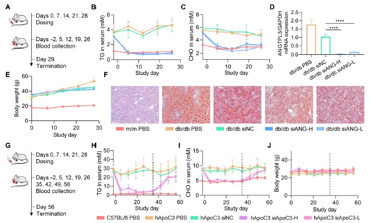 进一步,研究人员分别以饲料诱导的高脂血小鼠、db/db转基因小鼠以及人源化载脂蛋白C3(ApoC3)转基因小鼠作为疾病动物模型,模拟了人类由不健康饮食引起的高脂血症以及单基因表达异常诱发的高脂血症。实验结果证明,在经过重复给药后,0.25mg/kg的siRNA制剂在三种模型中均将疾病动物的血脂水平调整至与正常动物相当的水平。此外,0.5mg/kg的siRNA在db/db小鼠体内实现了97%的靶标mRNA表达下调。在转基因动物中,血脂水平在停药后4周后回复到治疗前。总的来说,由iLAND递送的siRNA极为高效地抑制了靶标mRNA的表达,进而带来了十分积极的降血脂治疗效果。