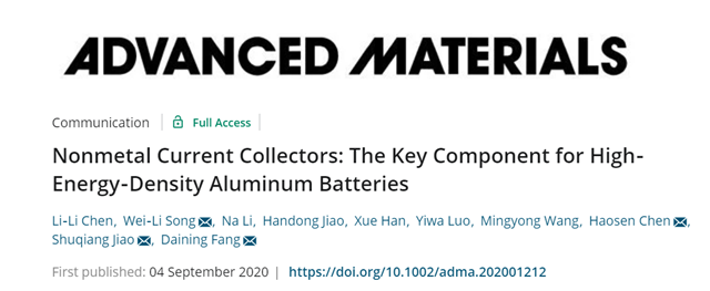 9月4日,国际顶级材料期刊《先进材料》 Adv. Mater. 2020, 2001212(期刊IF="27.398)以“Nonmetal current collectors: the key component for high energy density aluminum batteries”为题在线报道了安博官方网站先进结构技术研究院方岱宁院士与宋维力团队在非金属铝离子电池集流体的设计及应用方面的进展。