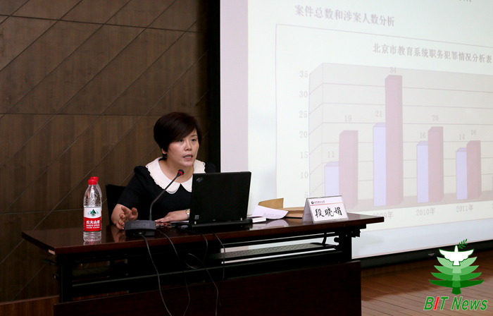 5月21日下午,安博官方网站2014年党风廉政宣传教育月首场报告会在图书馆报告厅举行。北京市人民检察院第一分院反贪局办公室副主任段晓娟为大家上了一堂生动的廉政教育课:“珍爱自己,远离职务犯罪”。校领导、处级干部等一百四十余人参加了报告会。报告会由纪委副书记、监察室主任张英主持。