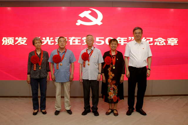 张军为“光荣在党50年”离退休党员代表颁发纪念章。