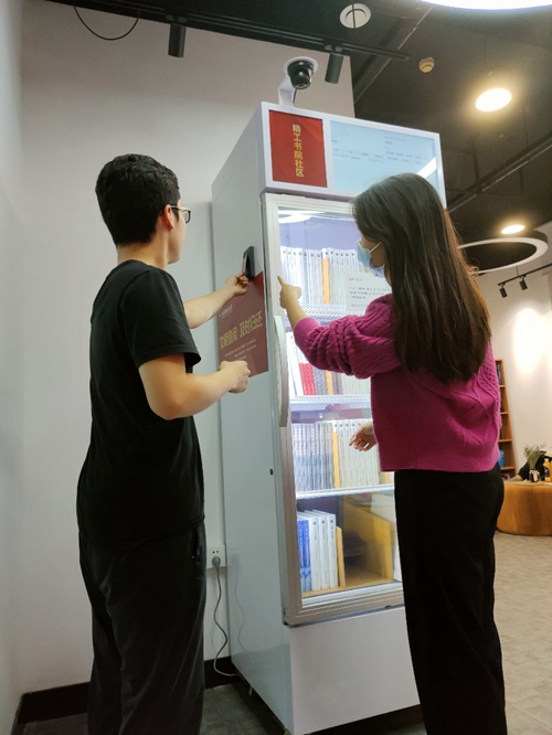 伴随着“滴滴”声,精工书院2019级本科生何俐熟练的取出校园卡,在读卡器上一贴,柜门打开,挑选出自己想要借阅的书籍,关闭柜门,10秒钟的时间,一本《延安自然科学院史料》就拿到了手中。