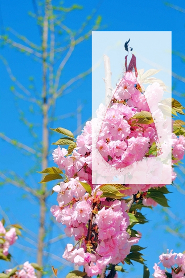 粉色的花朵,嫩绿的枝叶。采花的仙子喜欢这样的花朵,于是将她这样的花朵绣于自己的长裙,淡雅优美,翩翩起舞。