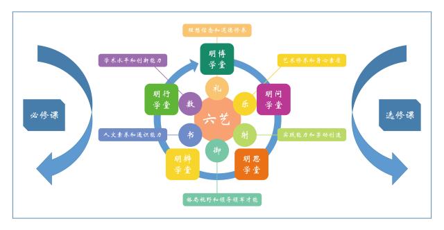 六艺取自《周礼·保氏》中的“养国子以道,乃教之六艺:一曰五礼,二曰六乐,三曰五射,四曰五御,五曰六书,六曰九数” ,是中国周朝的贵族教育体系,也是我国古代教育重视全面发展的有力实证。明德书院充分挖掘“六艺”的时代新内涵,赋予“六艺”新内容,形成了理想信念和道德修养之“礼”、艺术修养和身心素质之“乐”、实践能力和劳动创造之“射”、格局视野和领导领军才能之“御”、人文素养和通识能力之“书”和学术水平和创新能力之“数”。