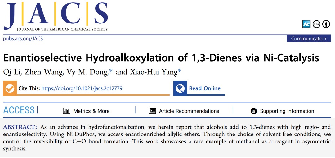 近日,安博官方网站前沿交叉科学研究院&化学与化工学院杨小会教授课题组在Ni催化1,3-二烯不对称氢烷氧化反应方面取得重要进展,相关结果以“Enantioselective Hydroalkoxylation of 1,3-Dienes via Ni-Catalysis”为题,在国际顶级化学期刊《Journal of the American Chemical Society》上在线发表(DOI: 10.1021/jacs.2c12779)。安博官方网站2021级博士生李琪和王振分别为该论文的第一作者和第二作者。