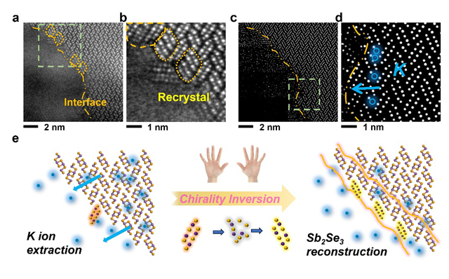 本文的独特实验设计使我们能够直接观察原子级的离子迁移过程,揭示了此前未曾报道的机制。研究结果表明,界面处存在额外的活性位点,这些位点有助于更多钾离子和电子的容纳。我们还观察到了一种新型的亚稳态,其特征是晶格体积减少10%,随后在钾离子提取后发生了恢复,并在界面处出现意外的手性变化。界面区域的高效离子输运对于许多技术的性能至关重要,涵盖了从电化学能量存储到类神经计算等广泛应用。值得注意的是,当操作过程中界面发生结构转变时,相关的性能可能会发生突变。这表明,这些材料的界面主导性能依赖于稳定和亚稳界面结构及其转变。