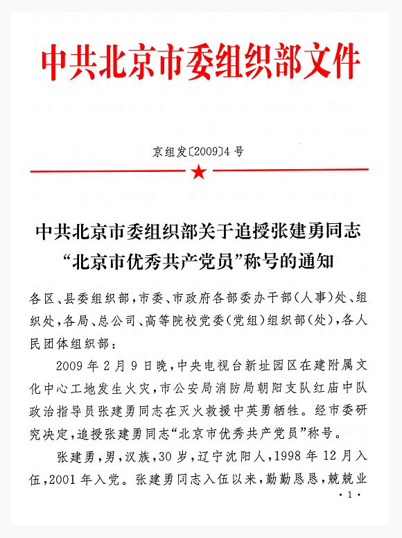 关于追授张建勇同志“北京市优秀共产党员”称号的通知